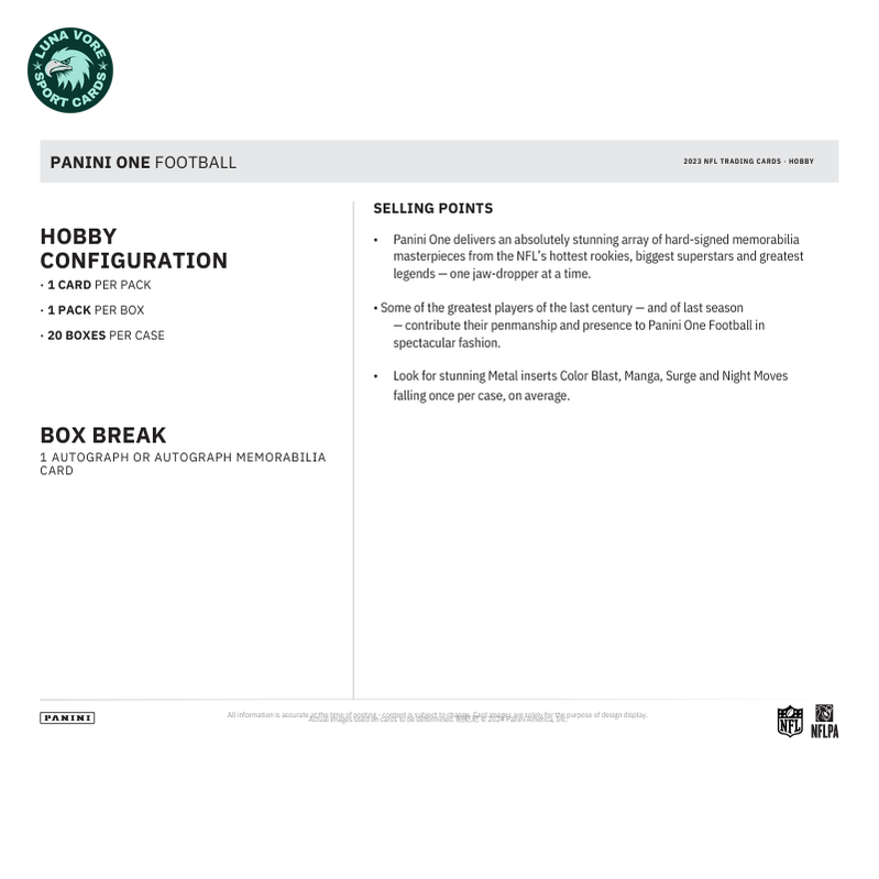 - Panini One delivers an absolutely stunning array of hard-signed memorabilia masterpieces from the NFL’s hottest rookies, biggest superstars and greatest legends — one jaw-dropper at a time.