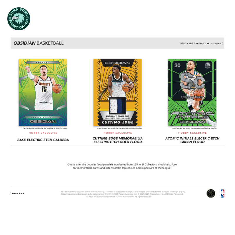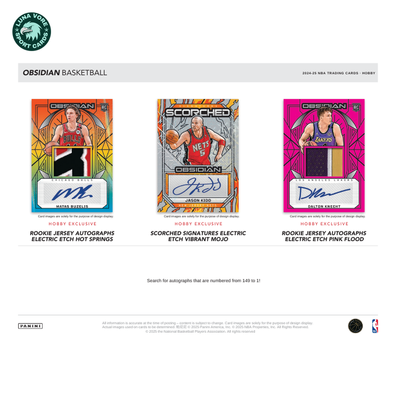The 2024/25 Panini Obsidian Basketball Hobby Box delivers a sleek and premium collecting experience, featuring the brand’s signature dark design with vibrant etched foil highlights. Each box averages 2 autographs and 2 inserts or parallels, showcasing a mix of the NBA’s hottest rookies, established stars, and all-time legends. Collectors can chase after popular autograph sets like Rookie Jersey Autographs and Volcanic Signatures, along with short-printed inserts such as Color Blast Black and Electric Etch parallels. Known for its bold look and limited print runs, Obsidian offers high-end appeal in every box, making it a must-have for basketball fans and collectors.