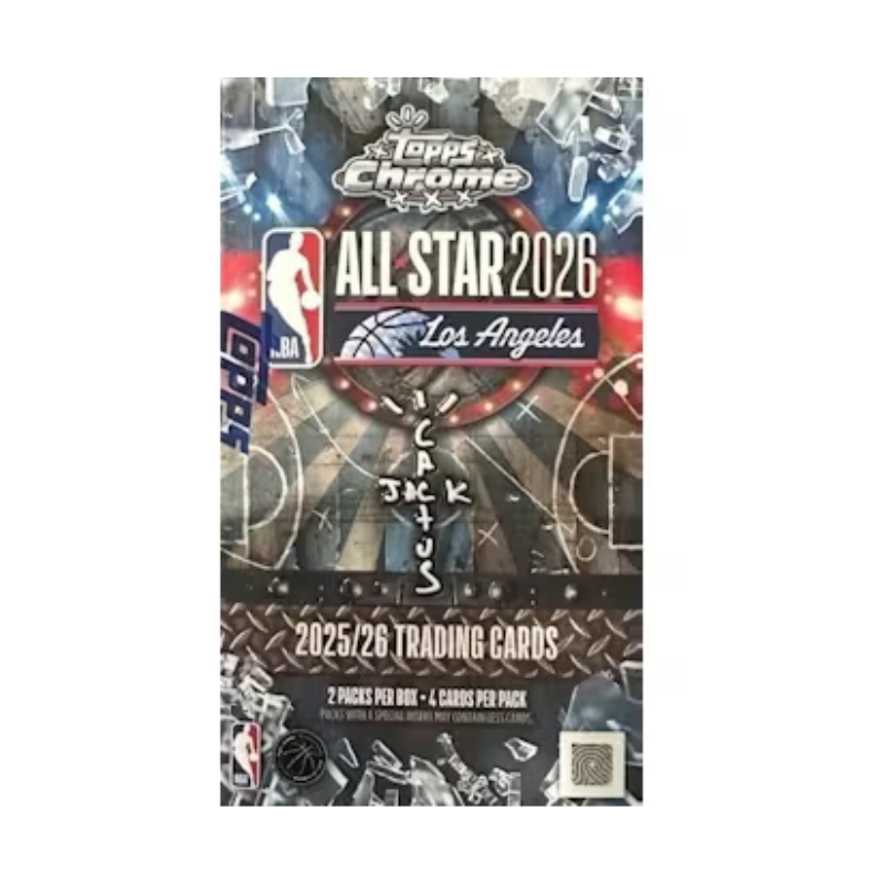 The 2025/26 Topps Chrome Cactus Jack Basketball x NBA All-Star Game Hobby Box delivers a stylish fusion of basketball and culture, combining the premium chrome technology collectors love with the creative influence of the Cactus Jack brand. Showcasing some of the league’s brightest stars and newest rookies, the set features vibrant designs, limited parallels, and exciting insert themes inspired by the spectacle of All-Star Weekend.