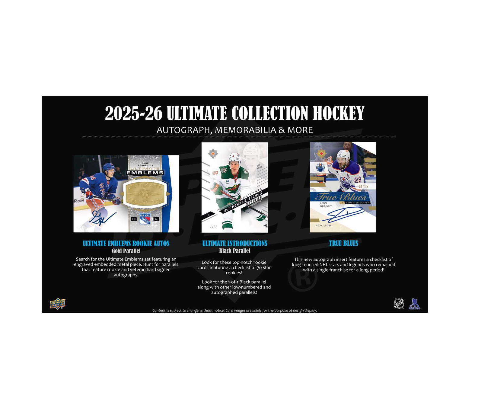 - 2025-26 Ultimate Collection hockey is one of the most anticipated Upper Deck trading card products of the year! Ultimate Collection sports a 100-card Base Set, including 75 Veterans (1-75) and 25 Greats (76-100)!