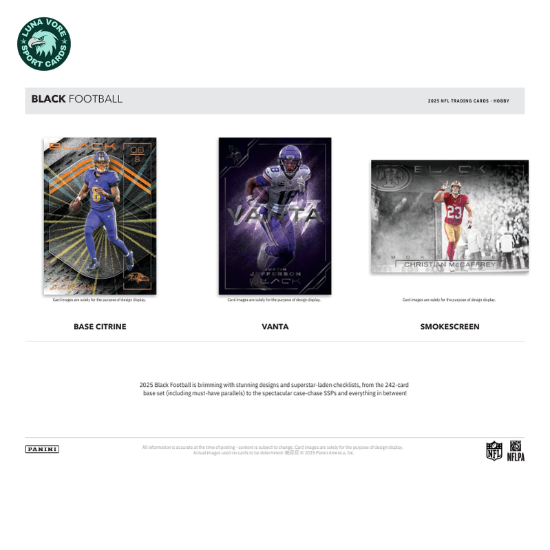 - 2025 Black Football is brimming with stunning designs and superstar-laden checklists, from the 242-card base set (including must-have parallels) to the spectacular case-chase SSPs and everything in between!