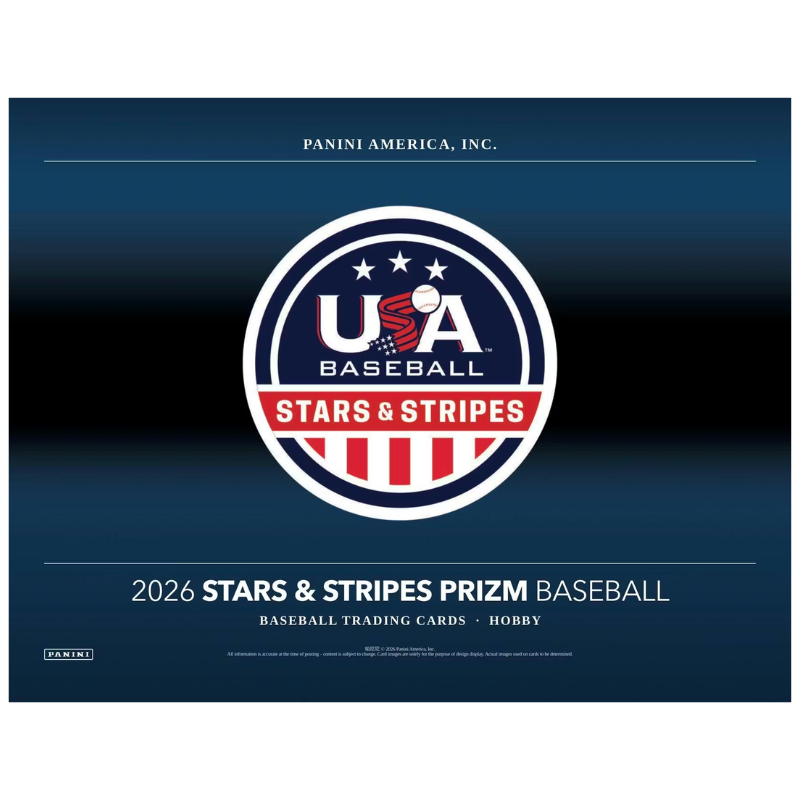The 2026 Panini USA Stars & Stripes Prizm Baseball Hobby Box marks the first time the popular USA Baseball Stars & Stripes program receives the full Prizm treatment, combining Panini’s iconic chromium design with the top prospects and alumni from USA Baseball. Each hobby box contains 12 packs with 12 cards per pack and delivers six autographs or memorabilia cards on average, along with 18 Prizm parallels and 12 inserts or insert parallels.