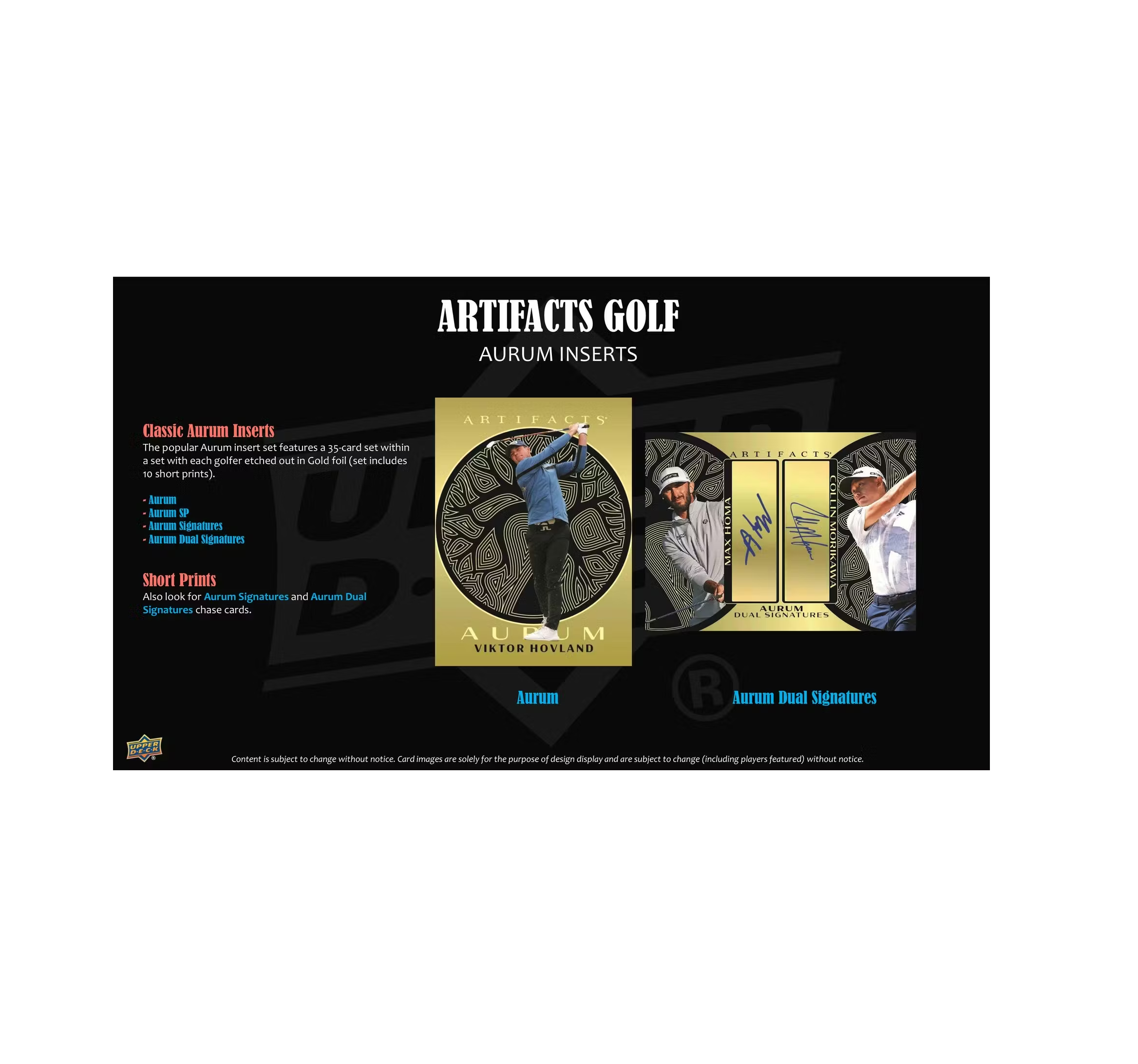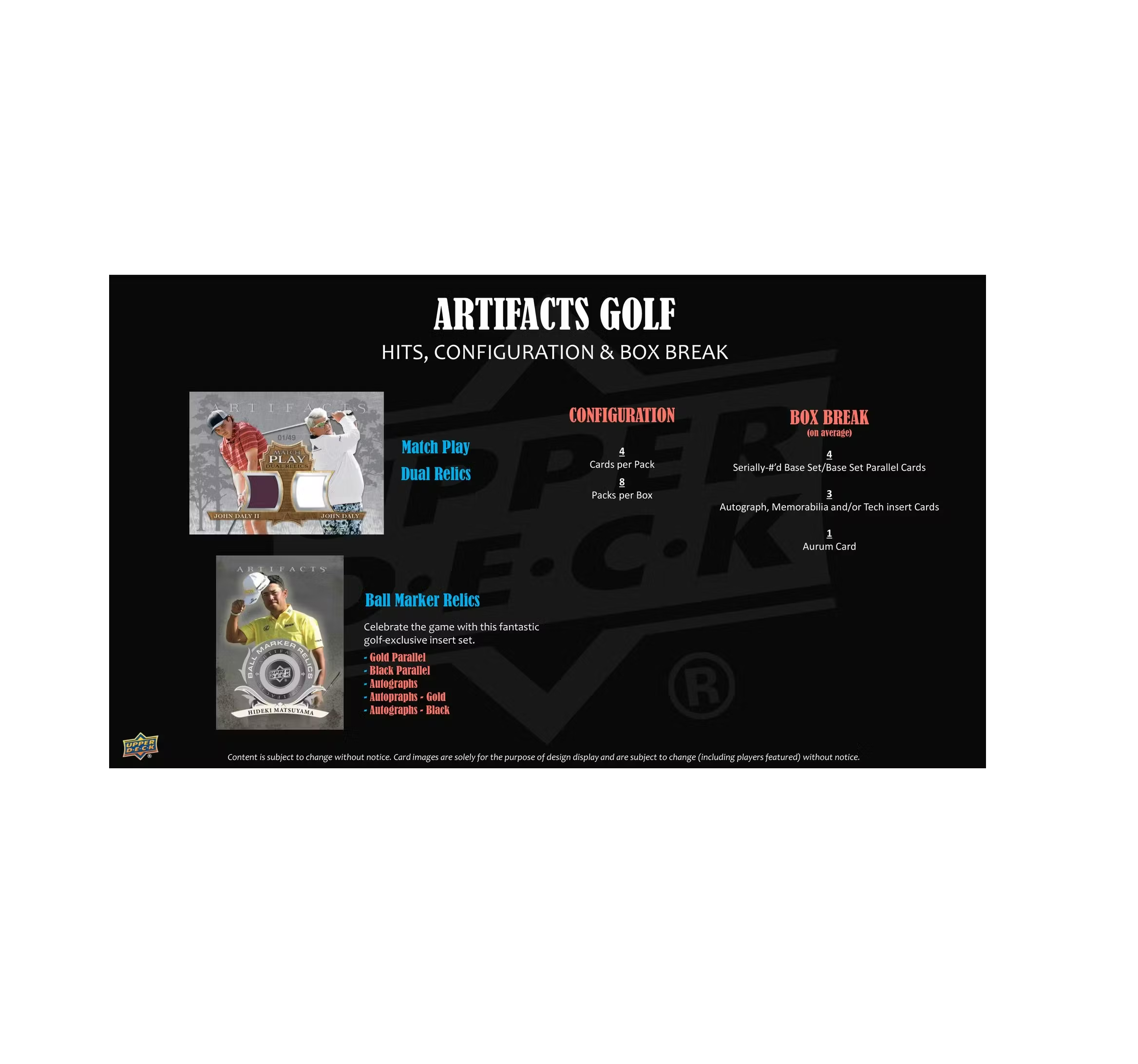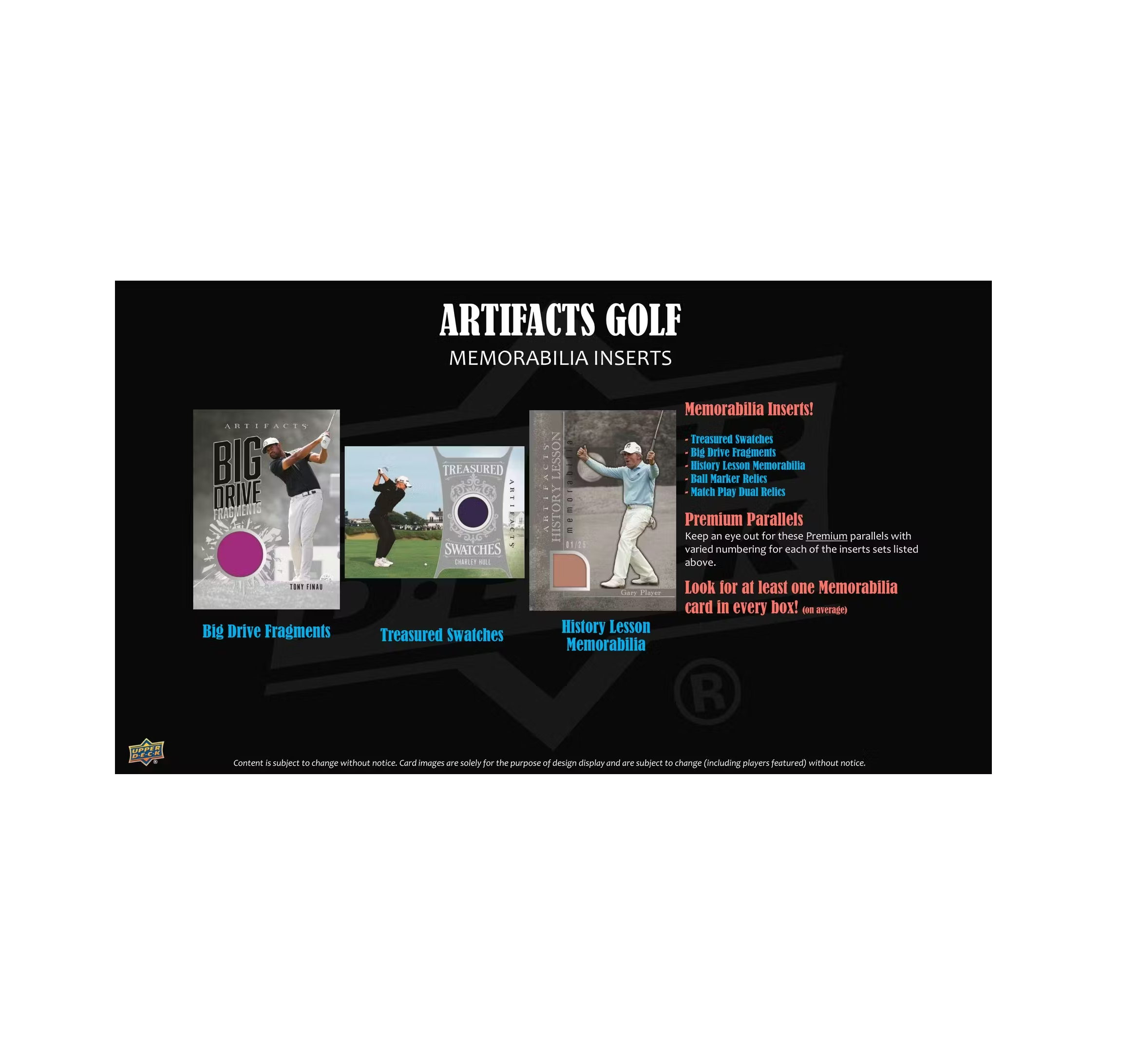 - Artifacts Golf returns to the golf portfolio, featuring a loaded 90-card base set that breaks down as follows (subject to change): Base Set (1-50), Rookies (51-80; #’d to 999), and Stars & Legends (81-90, #’d to 199)!